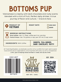 Vietnamese is creamy with dark chocolate and nutty scents blended with a hint of fruit. Perfect daily drinker. A true journey of flavor and culture.~ Gracie & Kaia