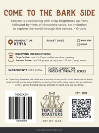 Kenyan is captivating with crisp brightness up front, followed by hints of chocolate spice. An invitation to explore the world through the senses. ~ Gracie